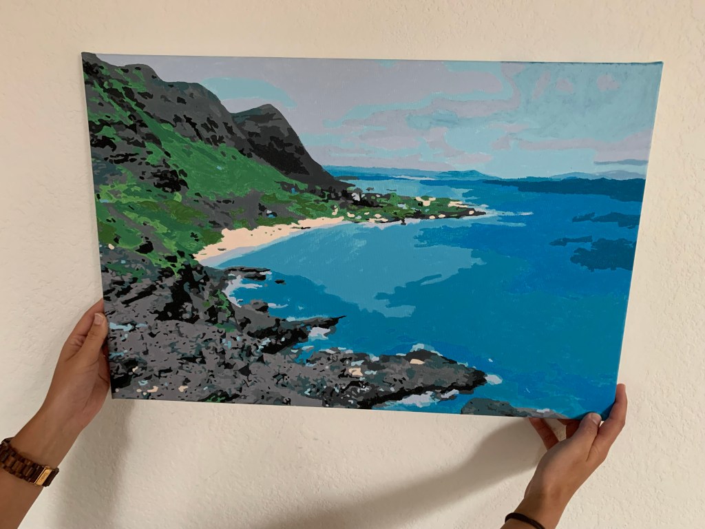 První dilema přišlo hned při objednávce – kterou fotku vybereme? Naši společnou, nebo krajinu? Moře nebo lesy? Po hodině dohadování jsme se shodly na fotce z Havaje. Jednoduchá fotka – nebe, oceán, hory, pláž. Na tom snad není co zkazit ne? Pár barviček.