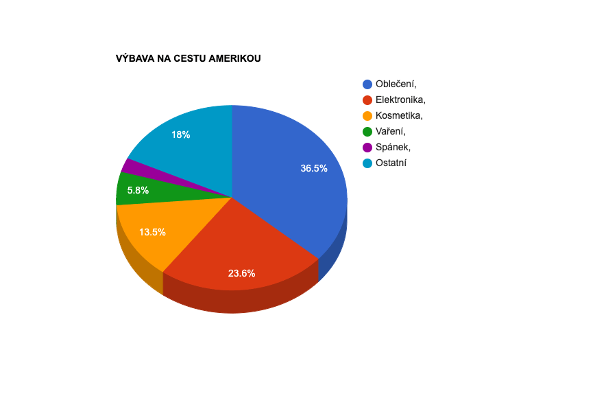 Celkově sebou vezeme 25 kg výbavy (včetně oblečení a bot, které máme na sobě), což není úplně špatné. Realita je zhruba 10 kg v batohu na osobu. Největší část samozřejmě zaujímá oblečení, které si nechceme kupovat na místě, ale zvolily jsme z velké části kvalitní Salomon značku. Kvůli naší tvorbě máme také nadbytek elektroniky. Kosmetika je spojena s lékárničkou. A co se vztahuje do kategorie ostatní? To co se jinam nevešlo – potápěčské brýle, moskytiéry, čelovky…