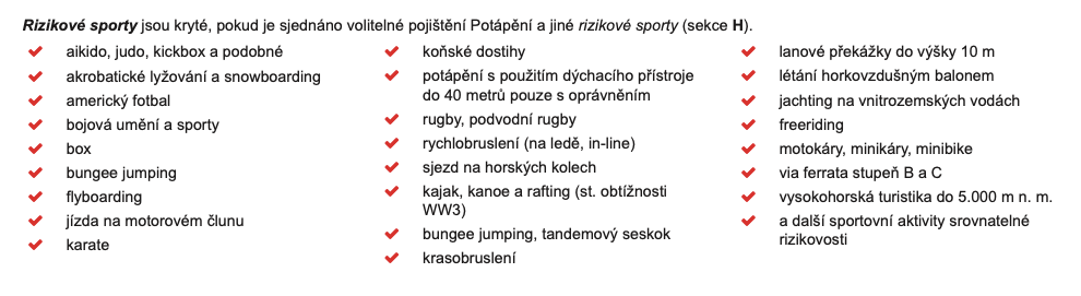 Pro představu přikládáme soupis rizikových sportů, které definuje pojišťovna Colonnade. (Většina pojišťoven totožná). Na tyhle sporty se musíte připojistit. Nepředpokládáme, že jedete do zahraničí primárně s cílem provozovat karate, či judo, ale člověk nikdy neví :D).
