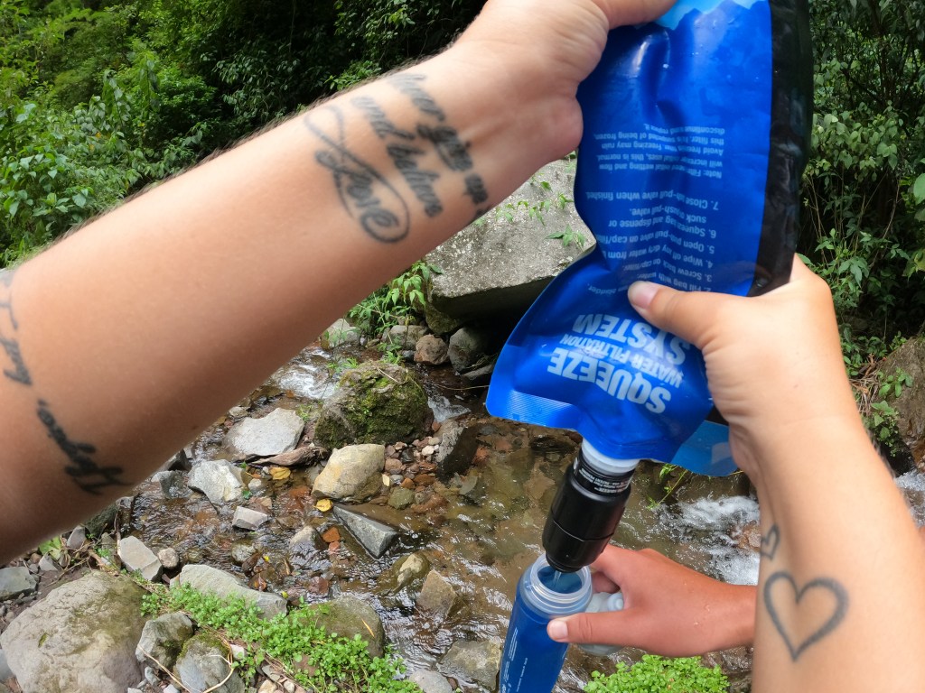 Vodu si nabíráme z jezírek, potoků, řek, lagun, ale i v hotelech z vodovodu. Nejen, že je voda bezpečná, díky vláknům, které zachytí parazity, bakterie, viry, ale dokonce chutná lépe. Jeden z případů, kdy si vodu nesmíte přefiltrovat, je z očividně špinavých a znečištěných vodních zdrojů, to by se vám filtr lehce ucpal. Filtr vždy po filtrování „vyfoukneme“, aby se v něm neusazovala žádná voda. Také jej pravidelně proplachujeme, aby nedošlo k ucpání a zpomalení průtoku. Stříkačku jsme si sebou nevzaly, ale vždy namontujeme z jedné strany láhev s čistou vodou, láhev pořádně stlačíme a filtr se tak propláchne.
