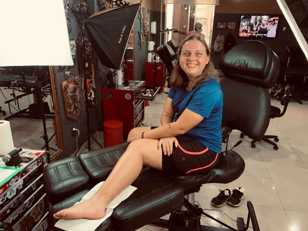 Tatér byl velmi profesionální a celý proces probíhal velice podobě jako u nás. Předkreslil si návrh, vytisknul samolepku, abychom si ho mohly odsouhlasit. Samotné tetování probíhalo asi 20 minut vzhledem k velikosti, šlo to opravdu dobře. Denča měla trošku obavu, jelikož se jednalo o její první tetování, ale byla nadšená a noha ji neupadla 🙂