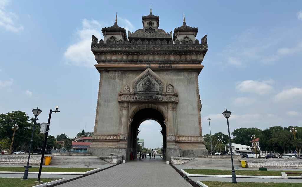 Prošly jsme se k Patuxai, vítěznému oblouku, který nám připomněl Paříž, ale se sochami a ornamenty čistě laoského stylu. Pod obloukem jsou nádherné malby. Vyšplhaly jsme nahoru a z vyhlídky jsme pozorovaly město – nízké budovy, spoustu zeleně, líně se klikatící řeku Mekong. Vstupné na vyhlídku je 30 000 LAK.