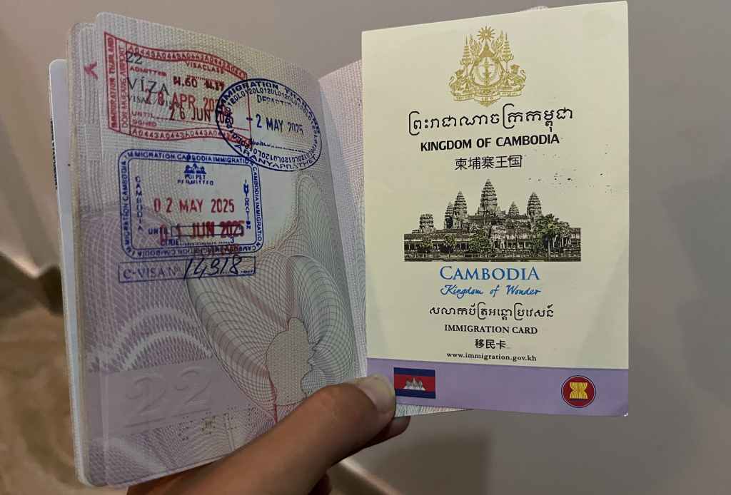 Na hranicích to jde velmi rychle. V Thajsku dostanete výstupní razítko do pasu, poskytnete otisky prstů, fotku a jdete. Poté projdete mezi hranicemi úsek přibližně 200 metrů do budovy Kambodži. Sedí tam chlápci, kteří rozdávají maličké kartičky k vyplnění, propisky jsou k dispozici. Vyplňuje se číslo pasu, jméno, příjmení, počet dní… Pokud nemáte víza, tak tady je i oficiální okénko k vyřízení! Poté vyčkáte frontu, úředník vás opět požádá o otisky prstů a orazítkuje vám kartičku i cestovní pas.
