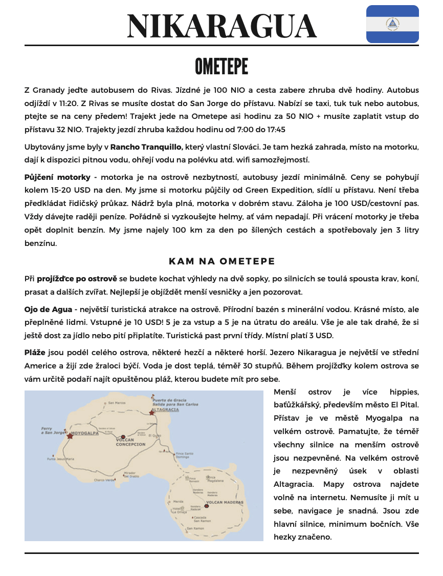 E-Book Střední Amerika má 50 stran formátu A4 plných fotografií a informací o této rozmanité oblasti plné zvířat, rostlin a sopek. Zjistíte jak si koupit sim kartu s internetovým připojením, jak se vyhnout otravám jídlem, kam vyrazit na výlet i praktické informace jak se na místo dostat veřejnou dopravou.